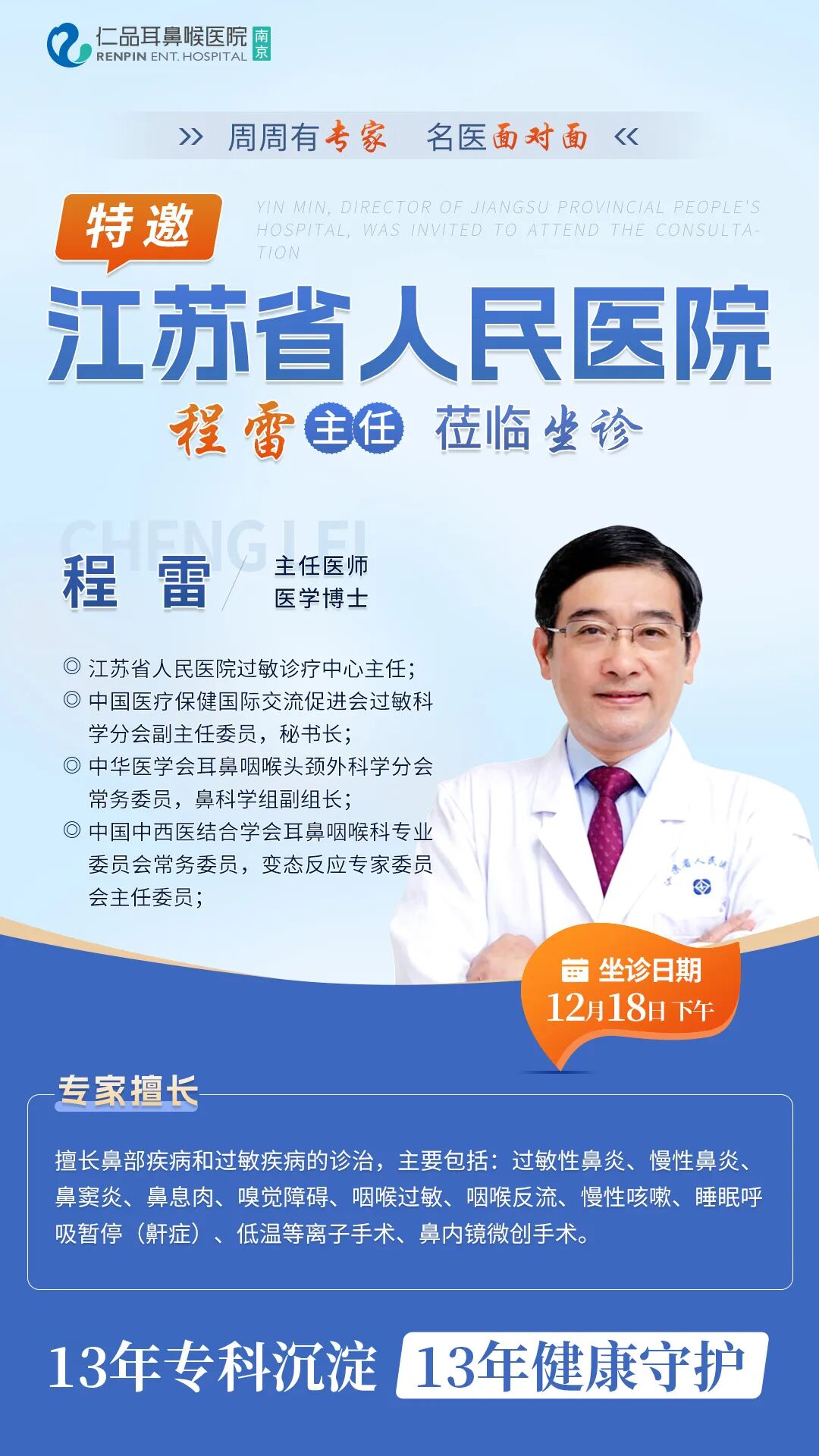 别让鼻塞、鼻痒毁掉你的冬日幸福感!12月18日(本周四)下午,江苏省人民医院过敏诊疗中心主任程雷教授将莅临南京仁品坐诊,有需要的患者可以提前预约,医院电话:025-85262032