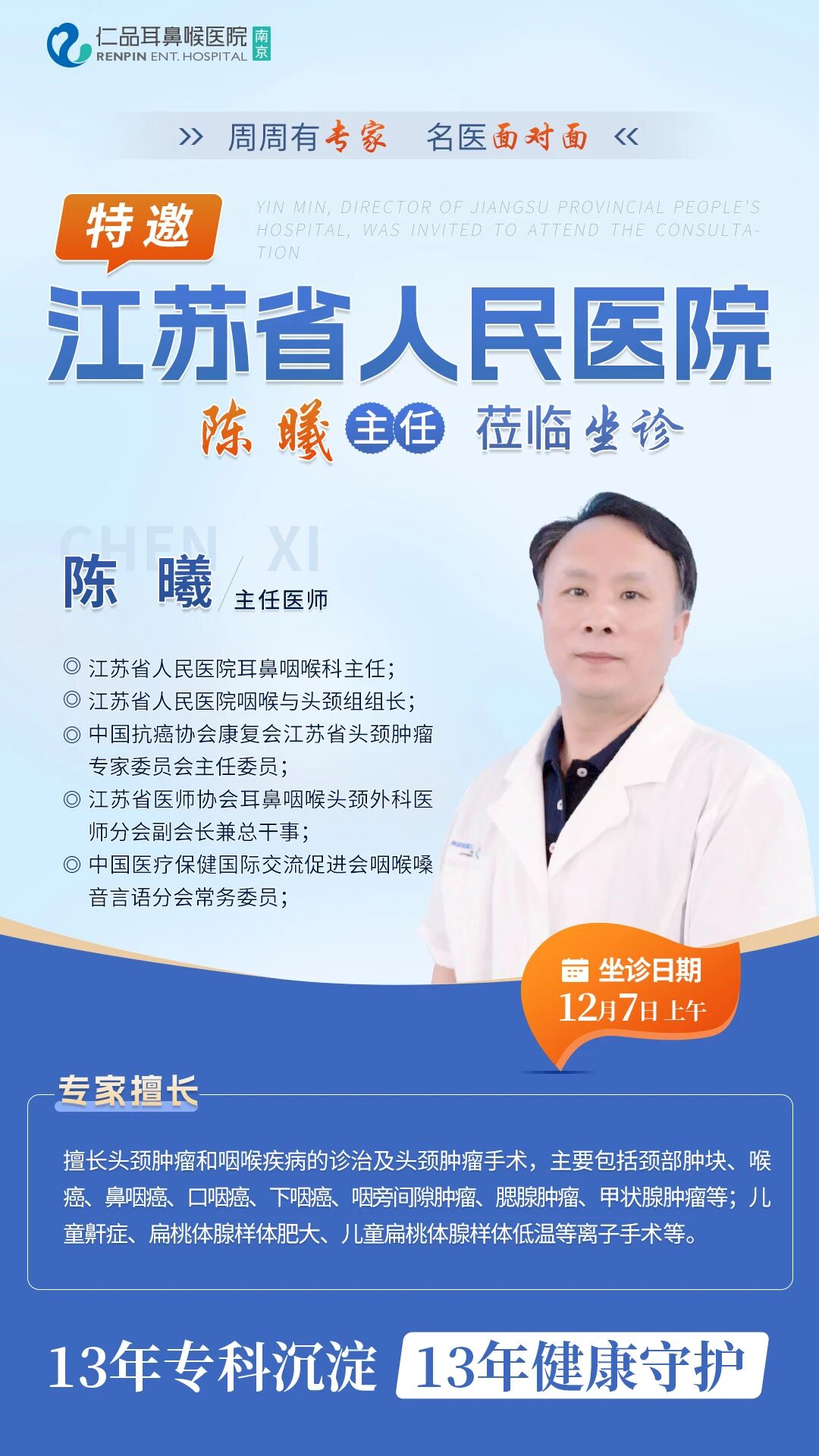 早发现、早诊断、早治疗,是战胜鼻咽癌的黄金法则。再次提醒,一旦出现持续性鼻塞、鼻涕带血、耳鸣以及颈部肿块等症状,尤其是症状持续不缓解时,应尽快到正规医院进行专业检查。12月21日本周日上午,我院特邀江苏省人民医院耳鼻咽喉科主任陈曦教授坐诊,为有需要的市民提供专业咨询和诊断。