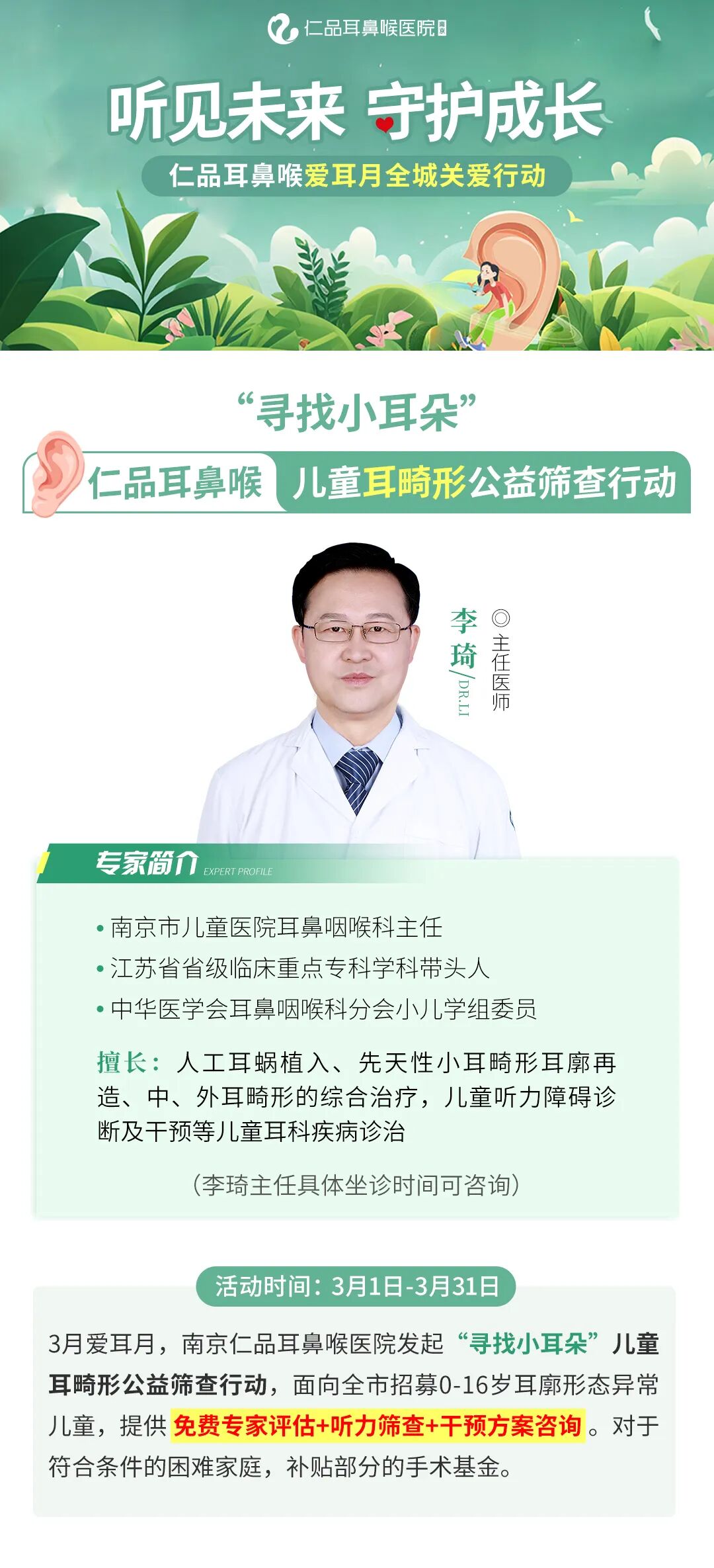 3月爱耳月,为帮助更多孩子及早发现、及早干预,扬子晚报、南京晨报联合南京仁品耳鼻喉医院,共同发起“寻找小耳朵”——儿童耳畸形公益筛查行动,面向全市招募0-16岁耳廓形态异常儿童,并将在3月15日特邀南京市儿童医院耳鼻咽喉科主任李琦来院,与本院专家团队开展联合会诊,为小耳天使提供面对面专业诊疗、定制个性化治疗方案!