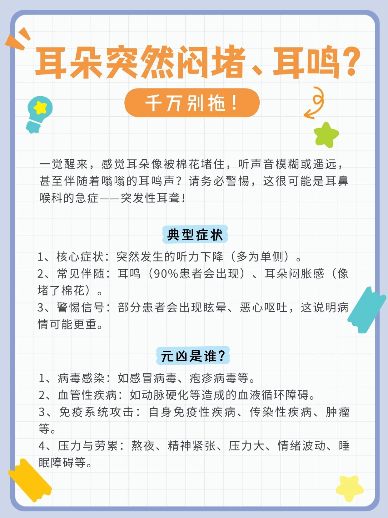 如果某天醒来,你也出现了耳朵发堵、听力模糊、耳鸣等症状,一定要立刻就医,抓住黄金治疗期,才能最大程度保住听力,避免留下终身遗憾哦!